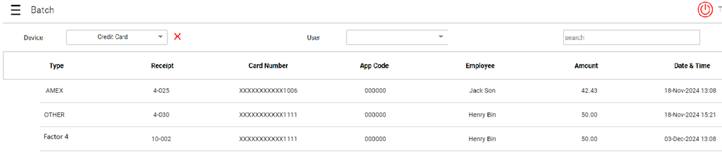 Factor 4 Receipts will be displayed on the Batch screen. (The Pax device can be selected from the device dropdown).