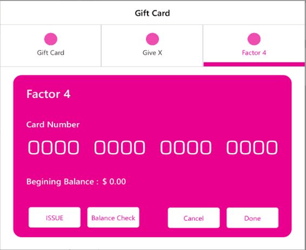 The Factor 4 tab appears on the Gift Card screen (Factor 4 is the default option when selected under POS Settings). When selected, the screen displays the Card Number and Beginning Balance, with the following button options: