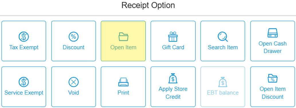 Note: Only Employees with the proper Role and Permission settings have access to create Open Items. In POS: tap on the Option icon at the bottom. On the Receipt Option screen, select Open Item. On the Open Discount screen: Select the Charge Type. If ...