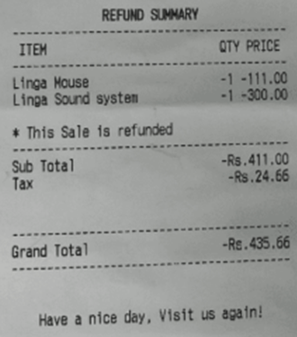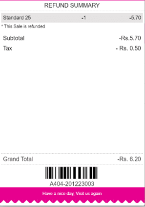 After Performing Refund All or Refund Item: a new receipt will be generated, and the receipt under Refunded Tab