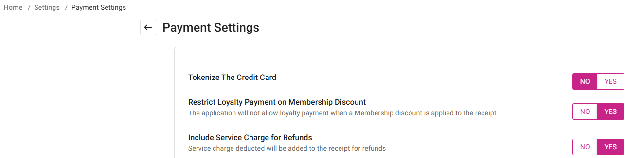 On the Payment Settings page includes the Include Service Charge for Refunds toggle which will be disabled (set to NO) by default.