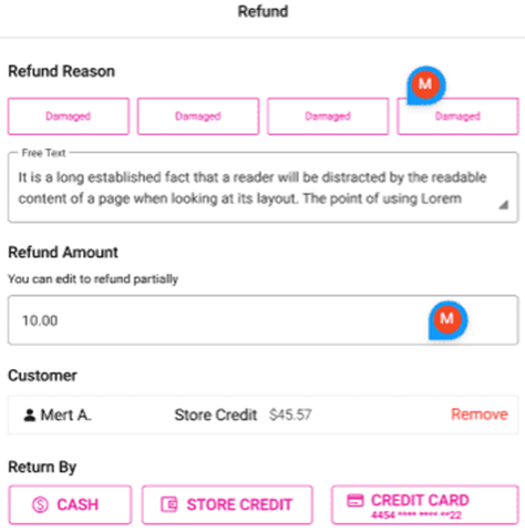 Select a Refund Reason (mandatory) from the options configured in Back Office, and you can enter any Free Text for further justification.