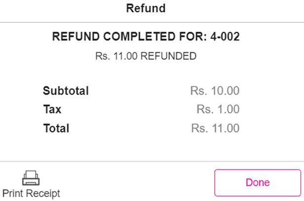 After the amount is refunded, the Refund Completed screen will appear which displays the Subtotal, Tax and Total.
