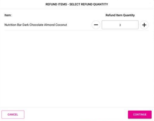 After selecting the quantity, click Continue and the Refund screen appears where you can still edit the quantity of the refund. To complete the refund, follow the above Refund process.