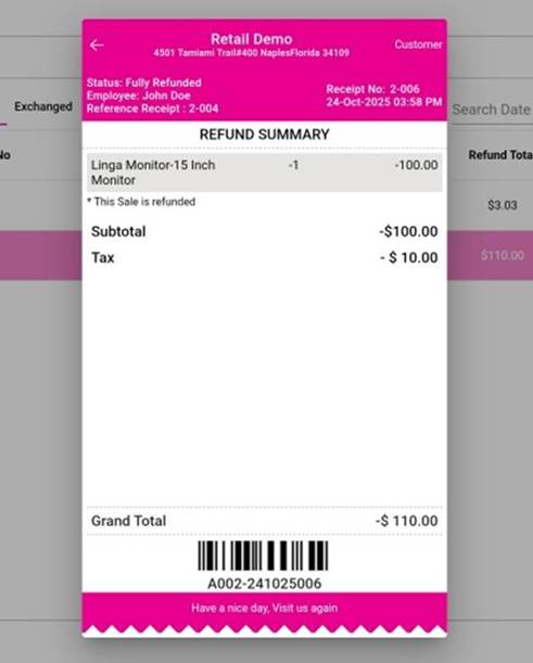 On the Digital Receipt screen, the Refund Receipt appears.
