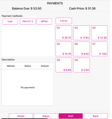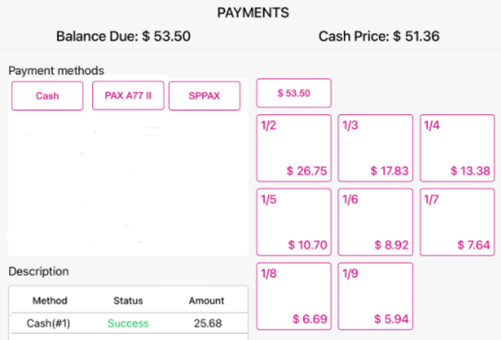 Select a Split option. The Total Amount and Balance Due will be displayed based on the split (below example: 1/2 of Cash Price $51.36 is $25.68).