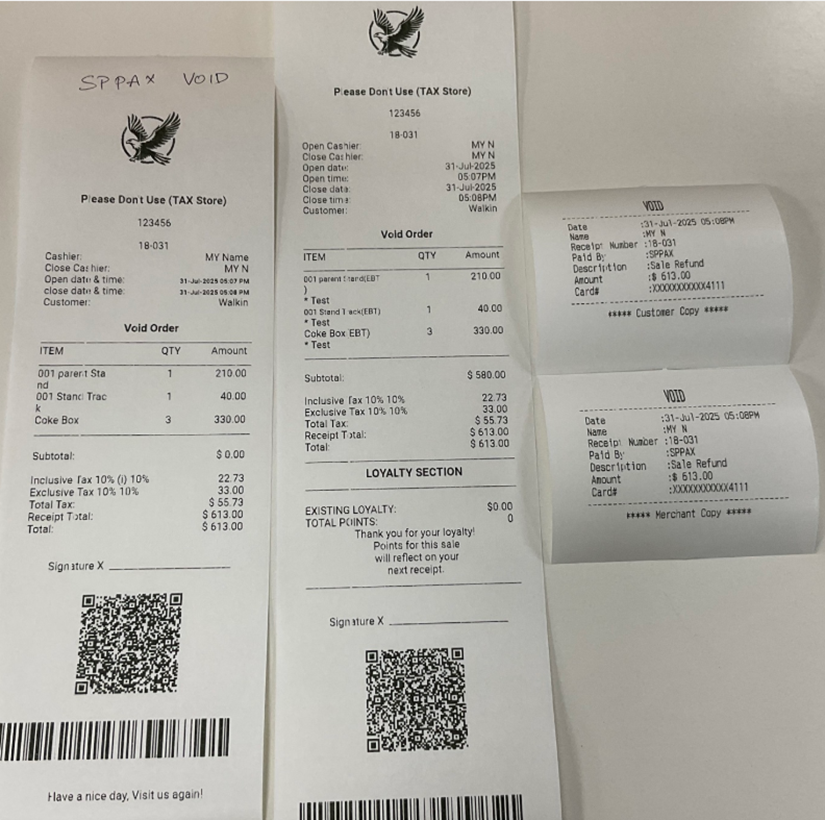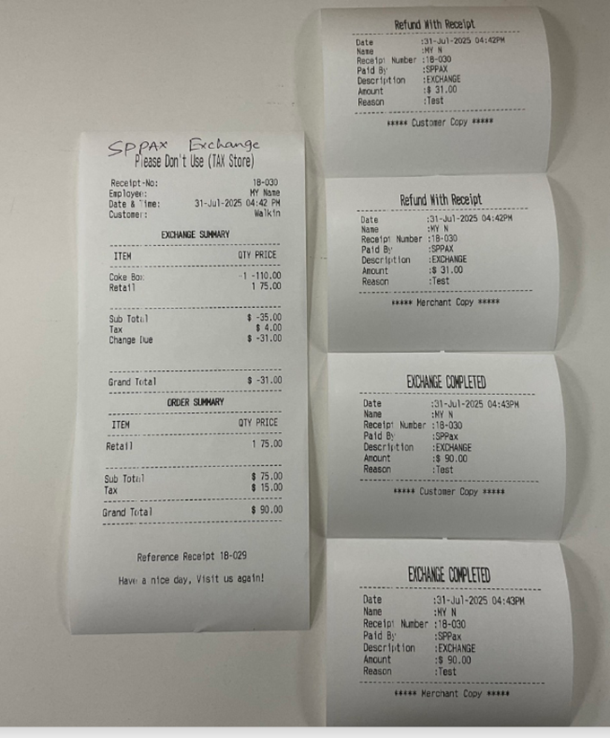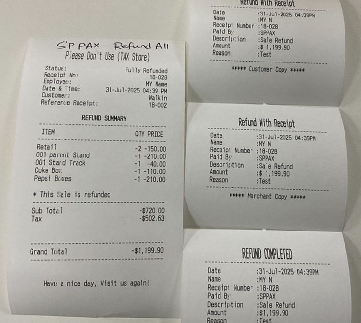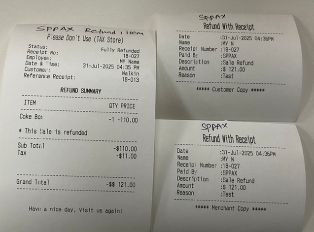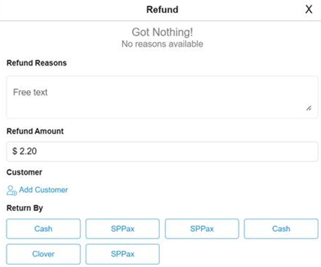 - A new receipt will be displayed along with the selected item and on the Refund pop up screen will appear and in the return by which displays the Payment Type SPPAX, the Amount will be refunded, and Reason must be provided for refund.