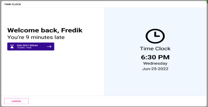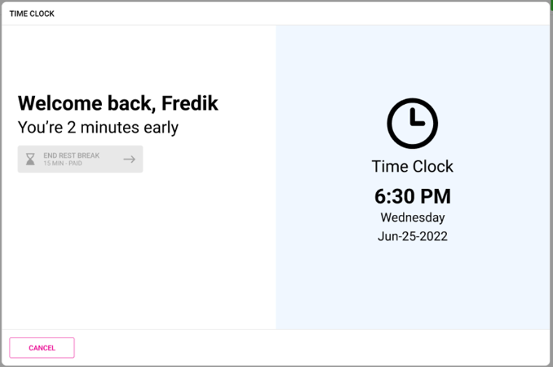 Upon clicking Cancel: the Employee cannot Clock-In and will be redirected to the previous Clock-In PIN entry screen. The X icon at the top-right corner also redirects to that same screen.