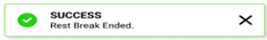 When an Employee ends their applied Break, the 'SUCCESS, Rest Break Ended' message will appear at the bottom of the screen, along with X icon. Upon clicking the X, the message will be closed.