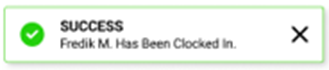 On the Login screen: the CLOCK-IN SUCCESS, XXXXXXX message appears, confirm the Employee has been Clocked In along with an X icon to close the message.