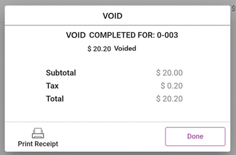 After the amount is Voided, the Void Completed confirmation will appear which displays the Amount Voided with subtotal, Tax and total.