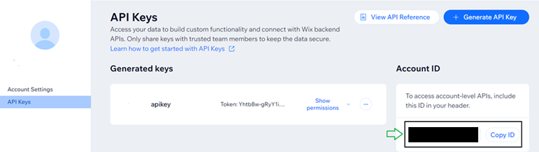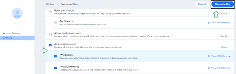 Enter a Name then select Wix Stores and Wix eCommerce permission and select Generate Key at the top-right. Make sure you copy the Token before closing the pop-up containing the Token. If you forgot the Token, it can be generated again.